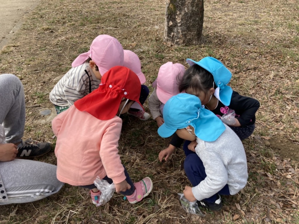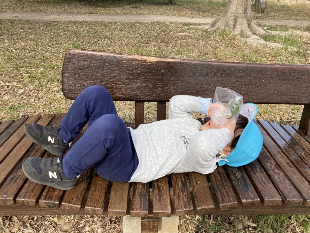 疲れたらベンチでひとやすみして、最後はみんなでテントウムシの所に集合!誰か捕まえられるかな…?