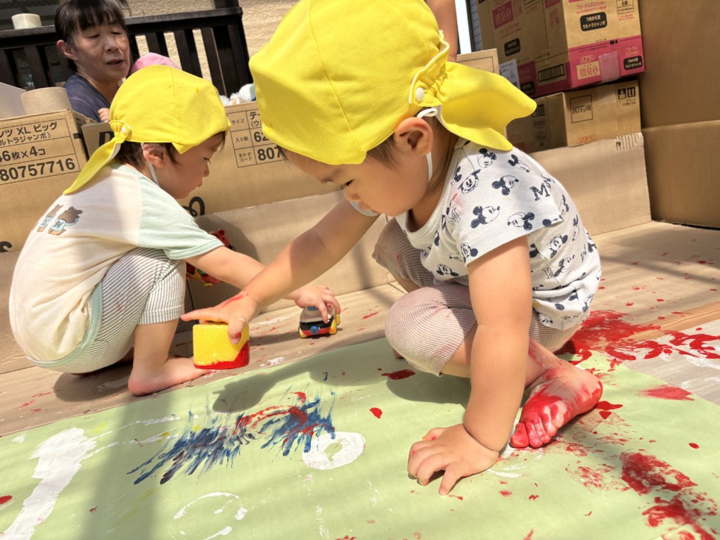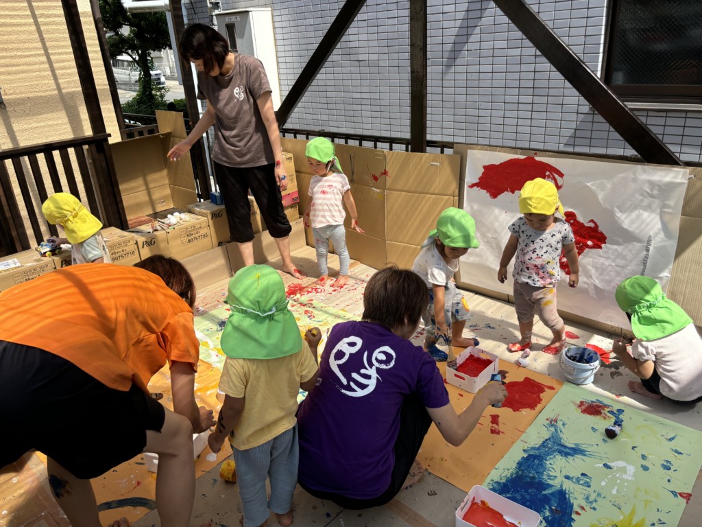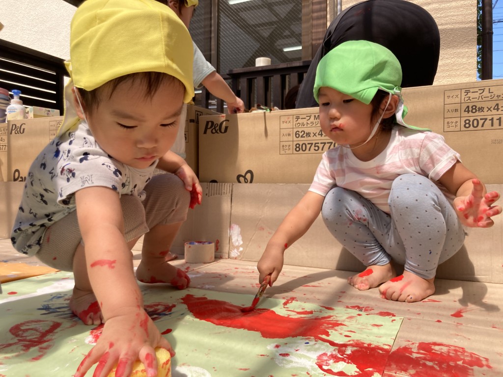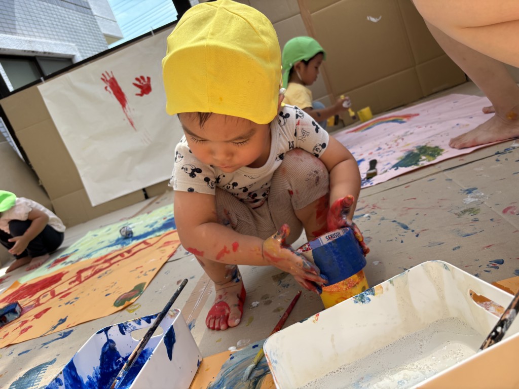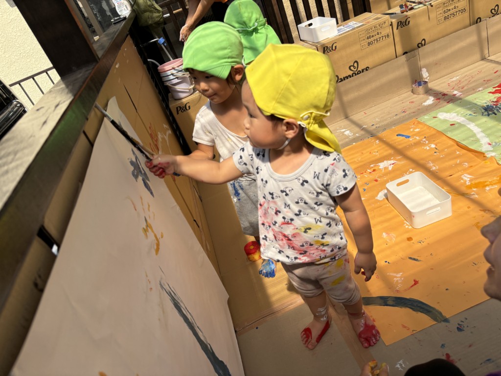 テラス全面に段ボールや模造紙を貼って準備し、保育士が率先して絵の具まみれになることで汚れることを気にせず大胆に楽しめる工夫をしました🎨まずは模造紙にちょっとずつお絵描きをして色がつくことを楽しみます。慣れてくると手形を付けてみたり足に描いてみたり、壁に描いてみたり、虹を描いてみたり….