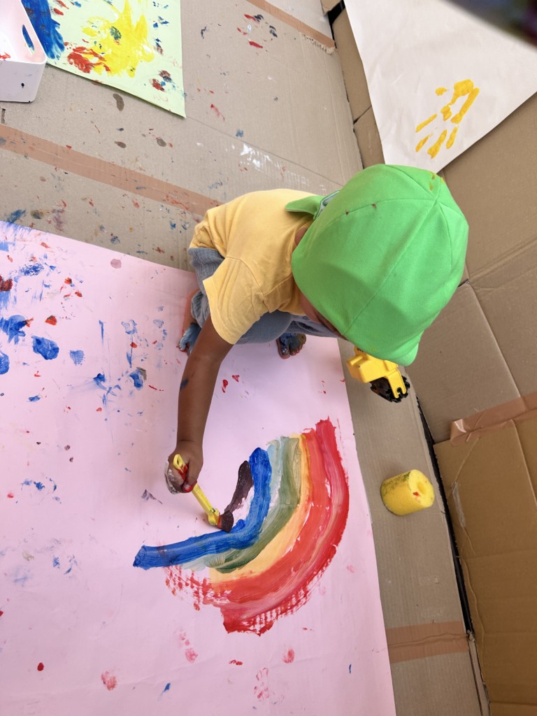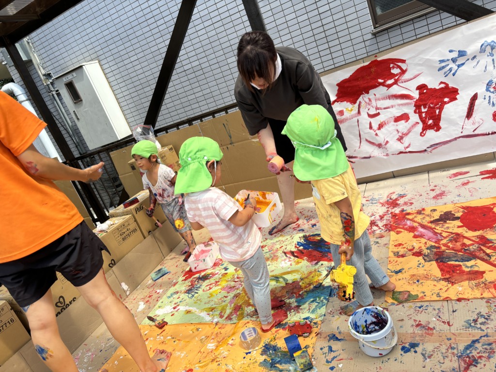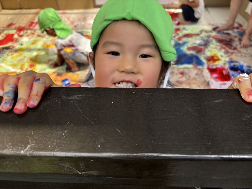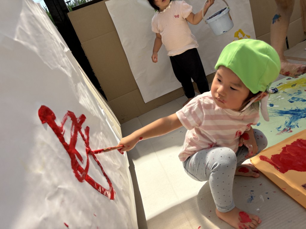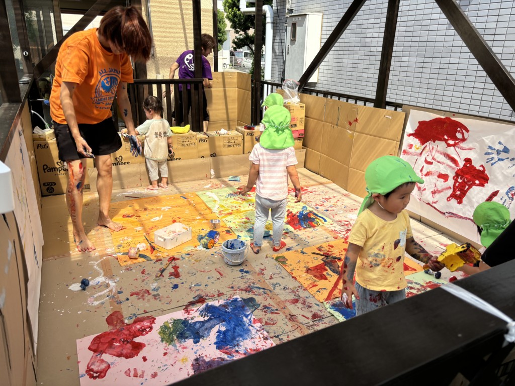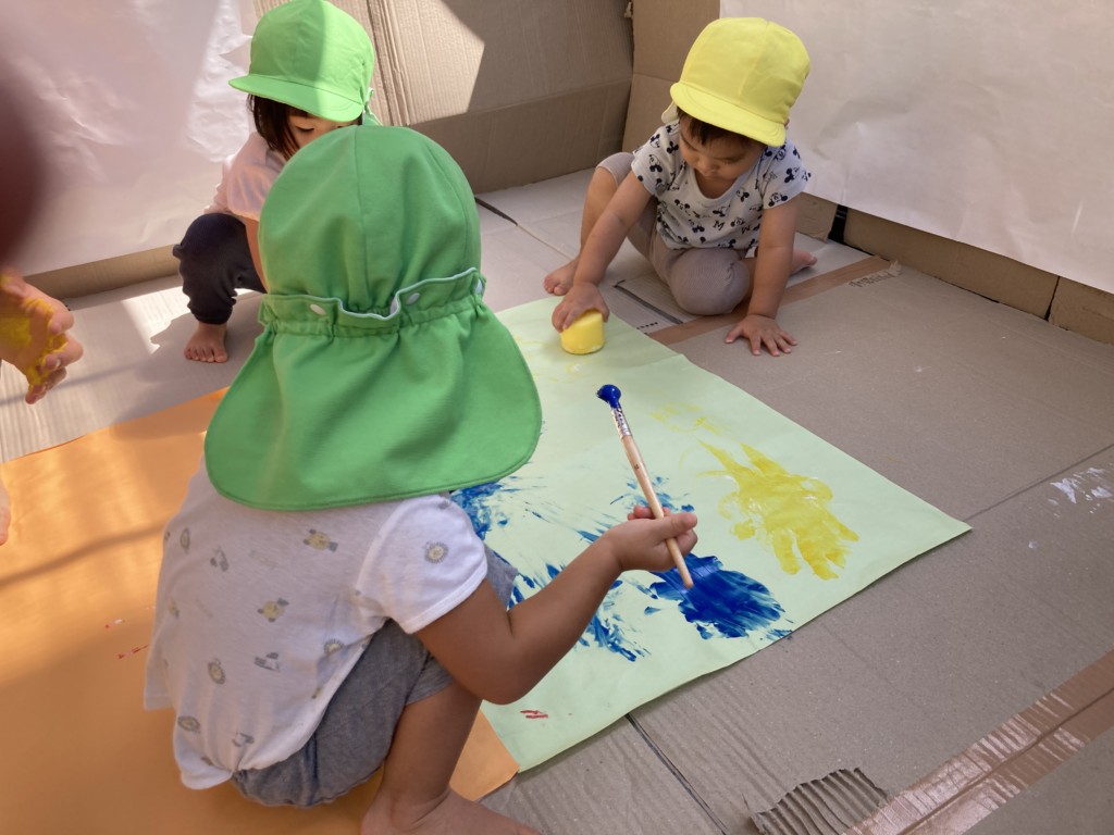 テラス全面に段ボールや模造紙を貼って準備し、保育士が率先して絵の具まみれになることで汚れることを気にせず大胆に楽しめる工夫をしました🎨まずは模造紙にちょっとずつお絵描きをして色がつくことを楽しみます。慣れてくると手形を付けてみたり足に描いてみたり、壁に描いてみたり、虹を描いてみたり….