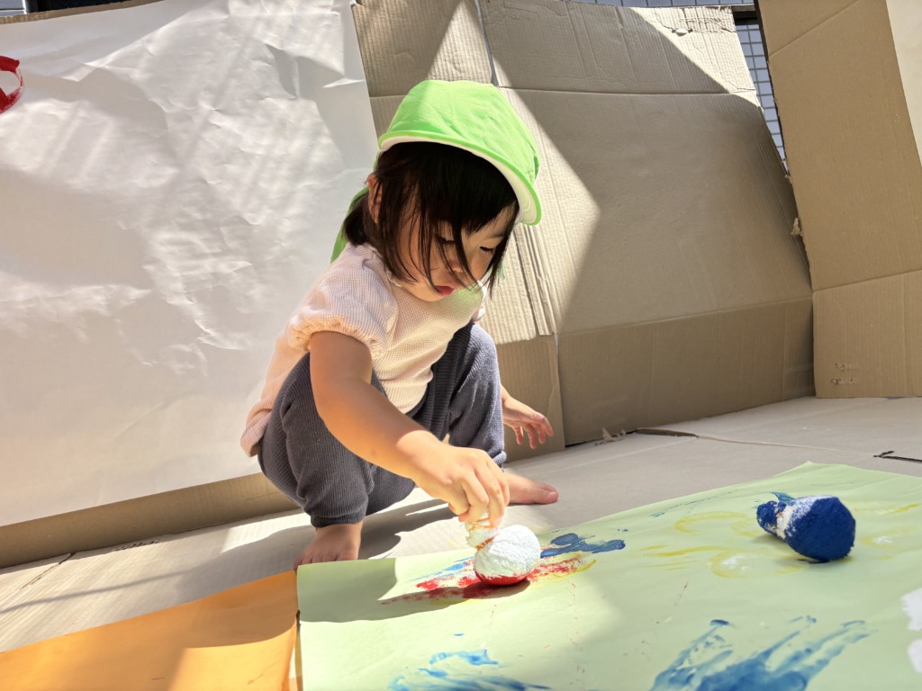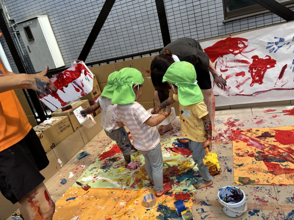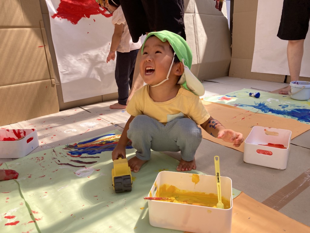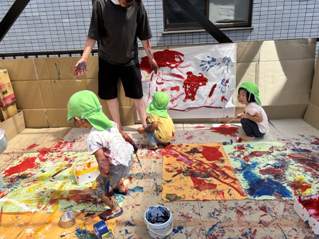 絵の具をペロペロ舐めるのは×だよ、等といった最低限のお約束だけを伝えたら、あとは子どもたちの発想のまま自由に!