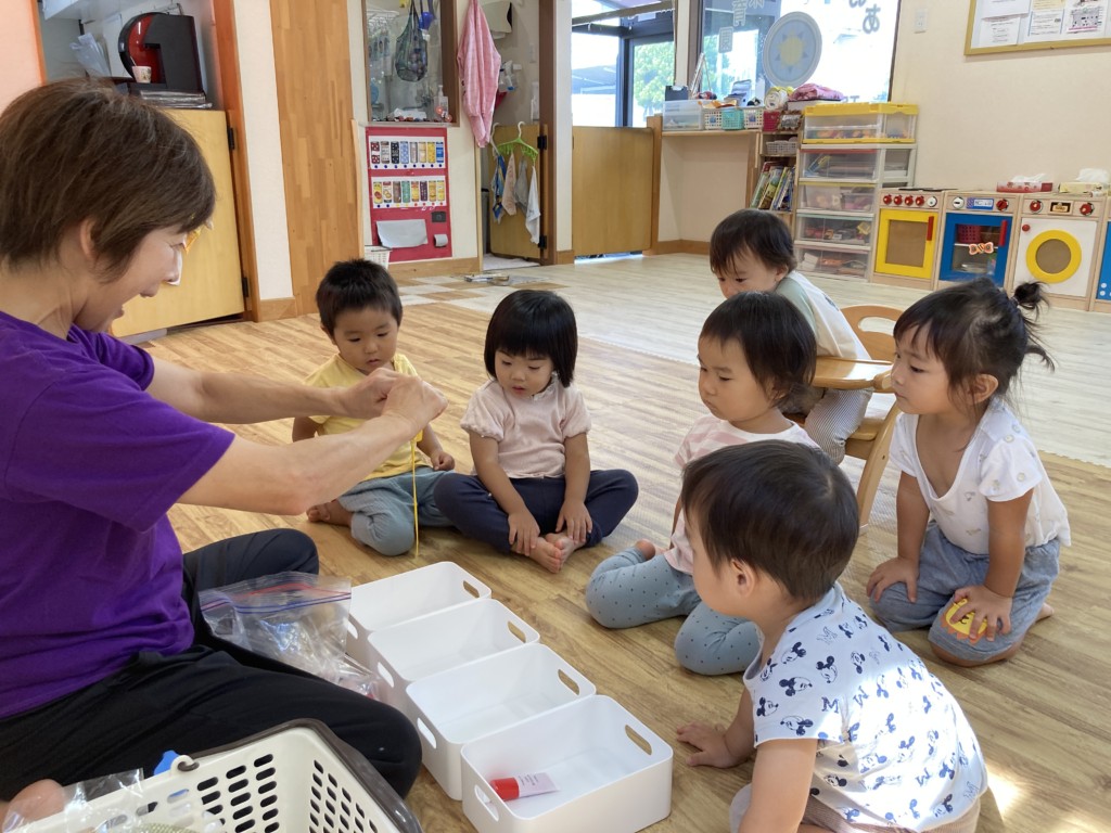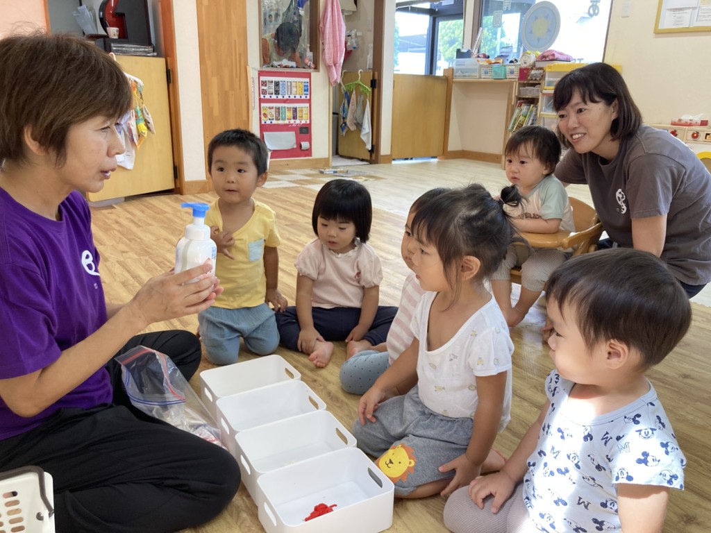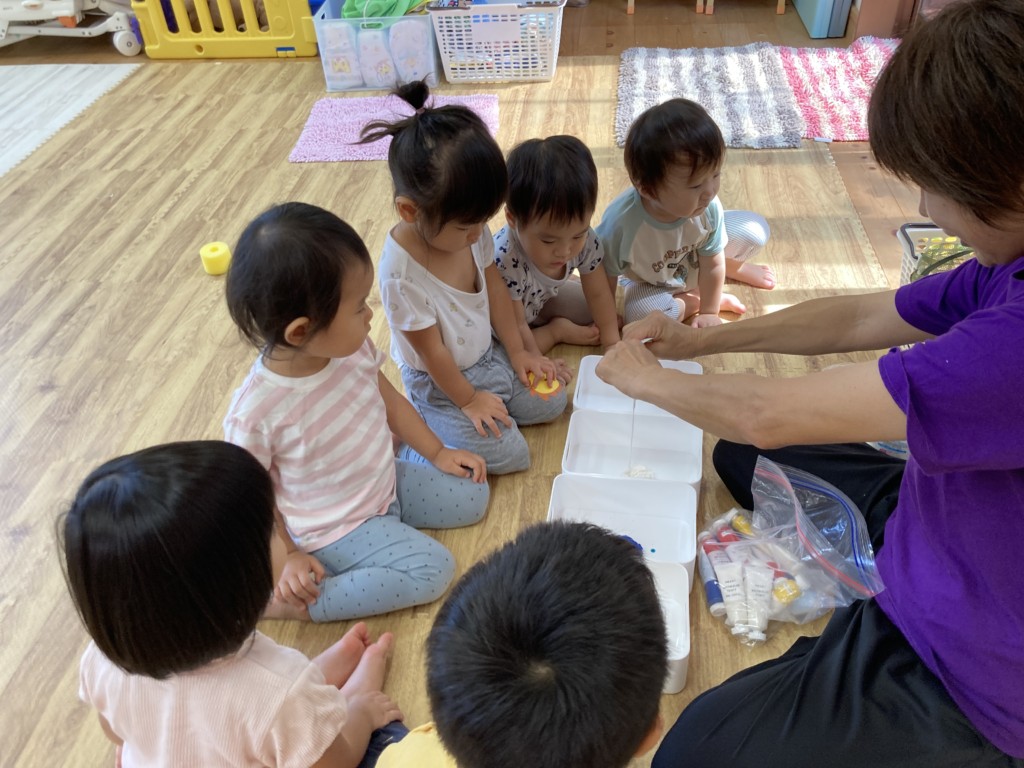 「絵の具ってこういう入れ物に入っているんだね」「お店で見たことあるよ」「(ボディソープを見て)それお風呂にある!持ってる!」「お家にあった!」「お風呂入るの?」と色々な言葉が飛び交い、子どもたちにとっては準備ひとつひとつがとても新鮮で、驚きと発見の連続です。