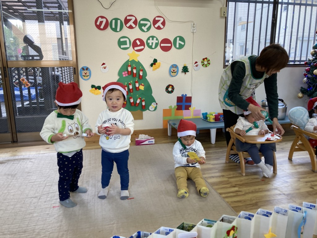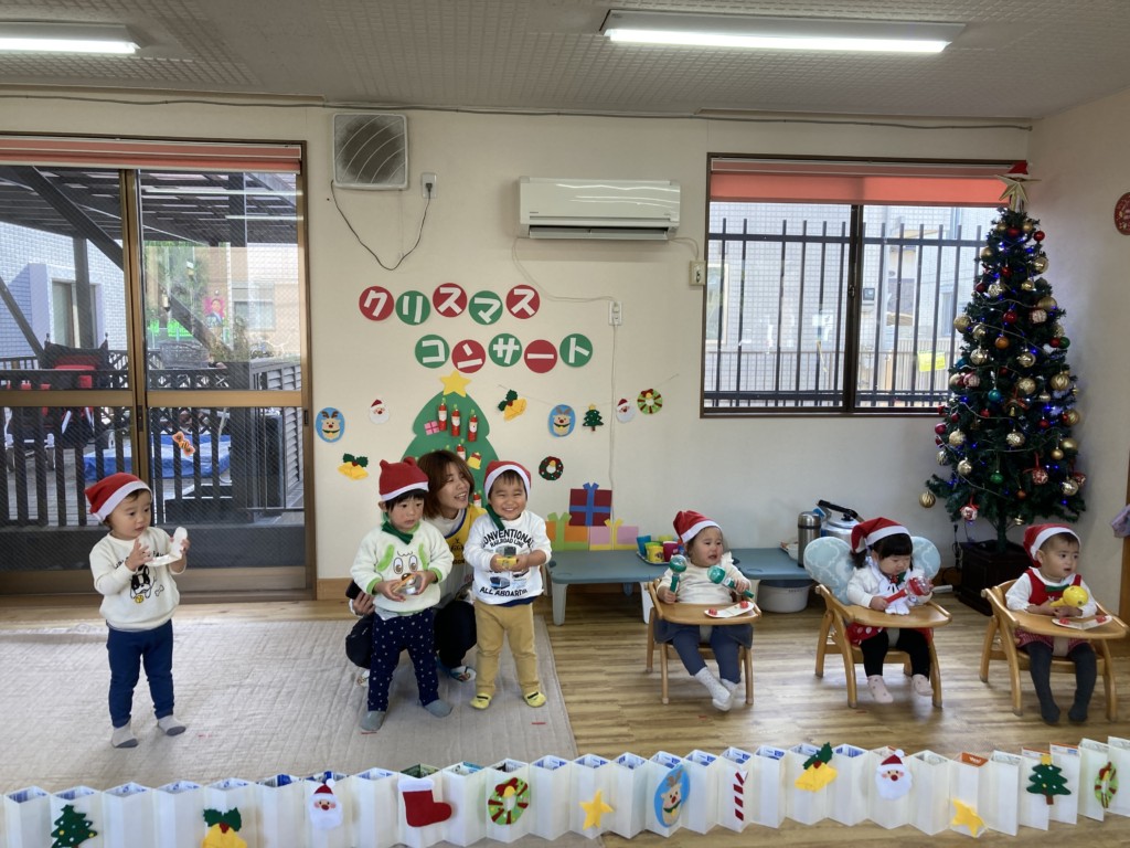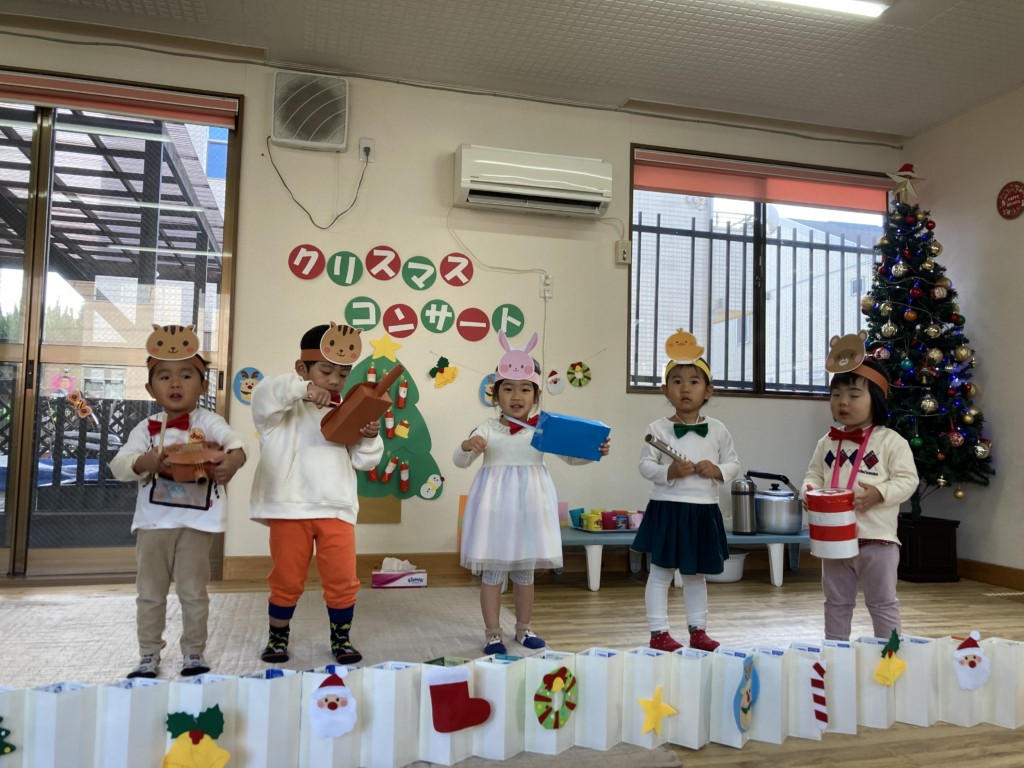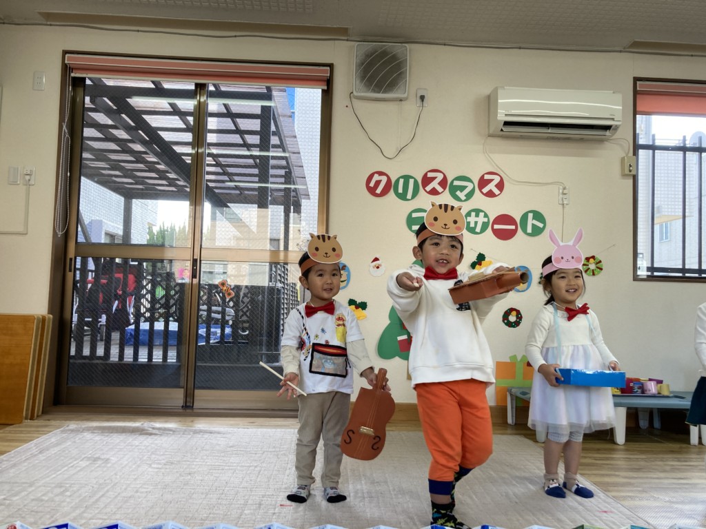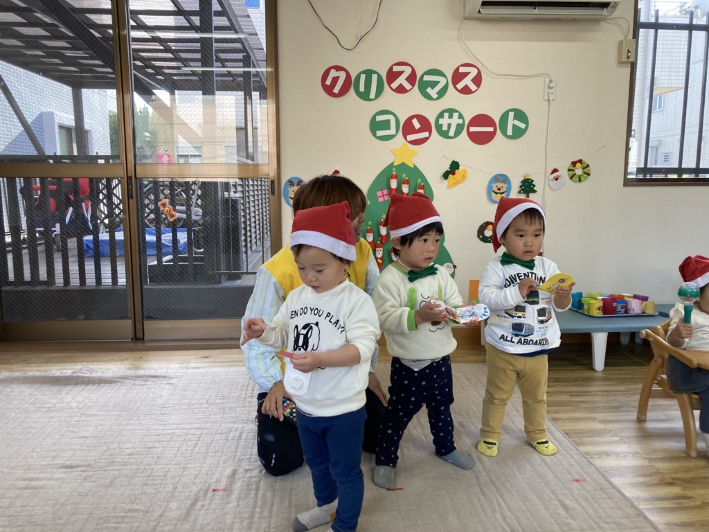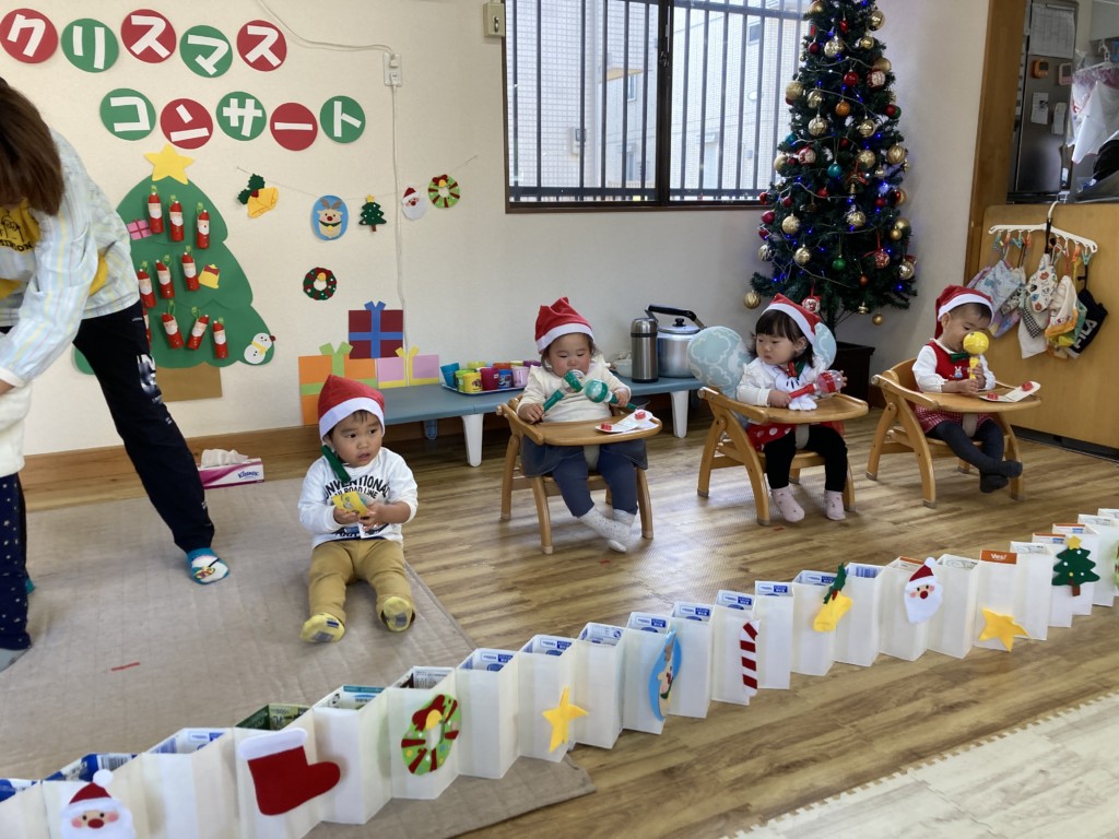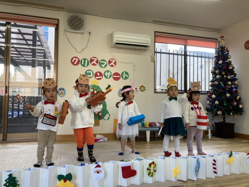 今年のクリスマスは子どもたちが主役となってコンサートを開催!日頃からきらきら星や手遊び歌などを口ずさむことが多く、音楽がかかるとノリノリで身体を動かしていた子どもたち。その姿からヒントを得て子どもたちが楽しく音楽に触れながら自由に表現ができるクリスマスコンサートを開催しました♪