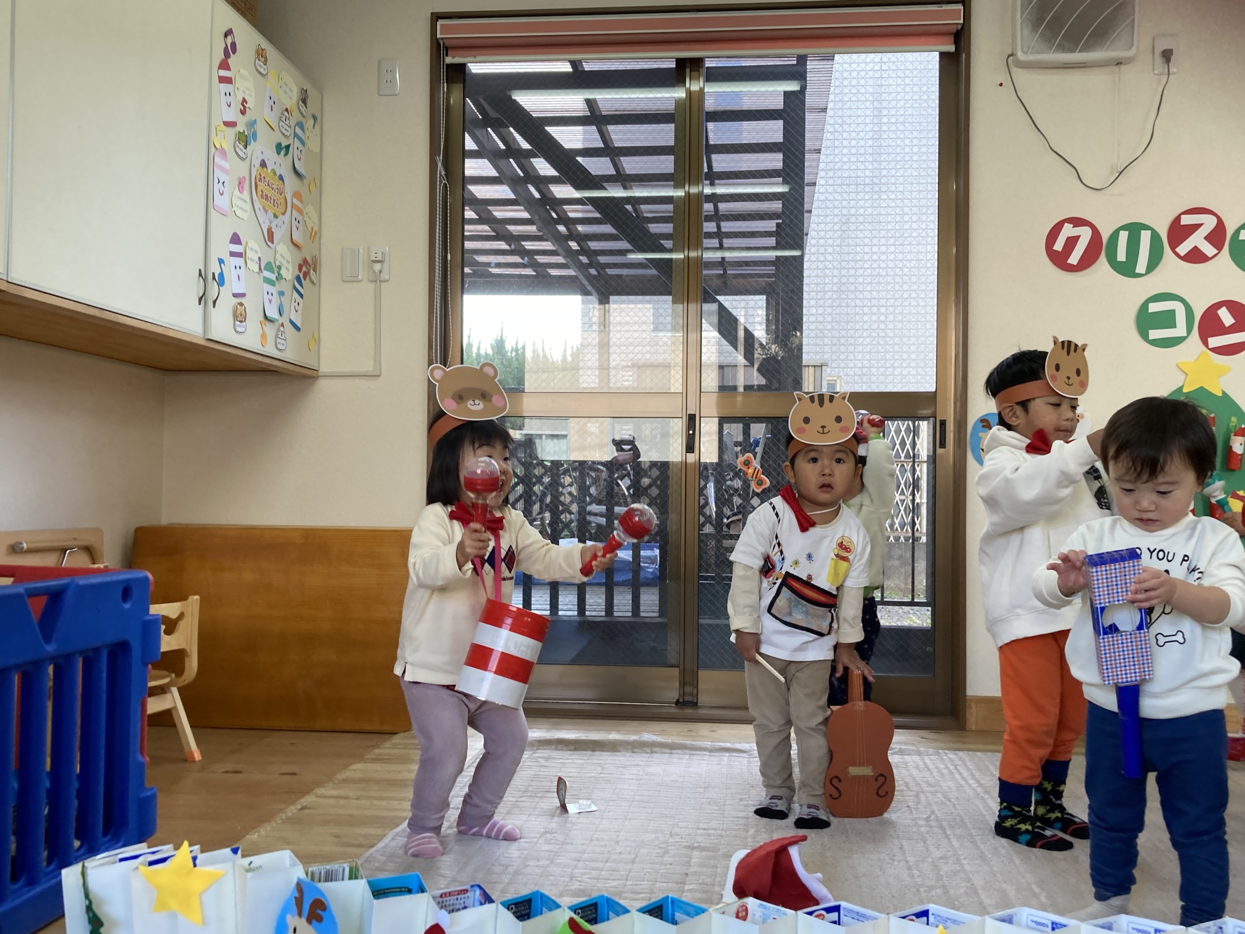 0.1歳児チームは「きらきら星」の曲に合わせて演奏し、2歳児はそれぞれが動物役になりきって「山の音楽家」を演奏しました。