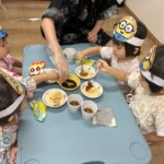 給食はタコさんウインナーが入った和風弁当、午後のおやつは焼きそばをキッチンカーまでもらいに行きました。